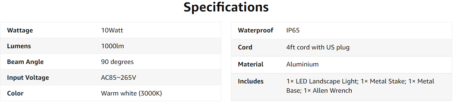 • Metal lamp body and large Cooling Fin ensure more efficient heat dissipation. Durable and sturdy bracket do not bend easily. Metal stake helps to keep the light stable in the ground.